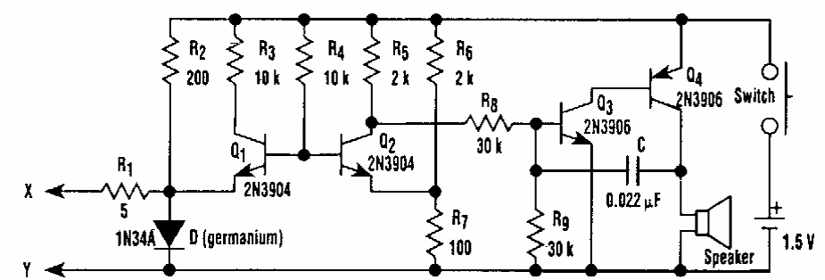 Na verdade, trata-se de um provador de continuidade sugerido por uma Electronic Design dos anos 90. Os transistores são de uso geral. A alimentação consiste numa única pilha.