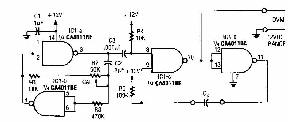 Este circuito foi encontrado numa Radio Electronics dos anos 90. Ele converte a capacitância em frequência de modo a se obter uma tensão proporcional que possa ser medida num multímetro comum.