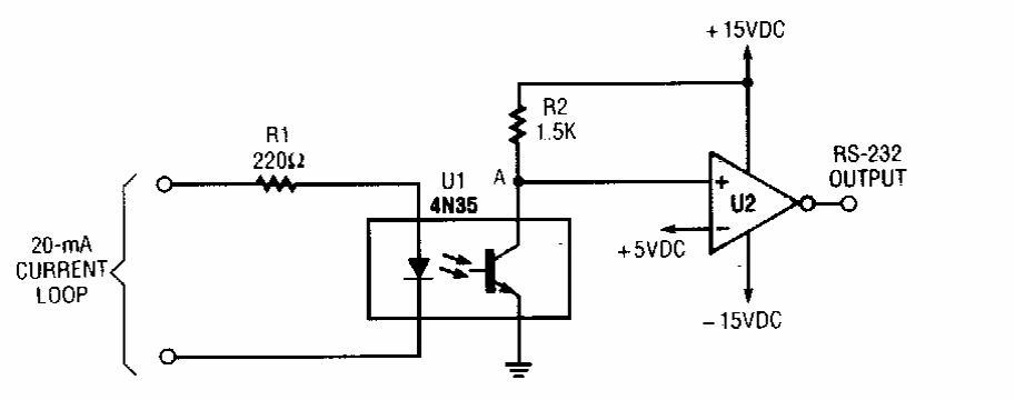 Encontrado numa Popular Electronics dos anos 9, este circuito tem saída para interfaces RS-232 e entrada de corrente. A fonte deve ser simétrica.