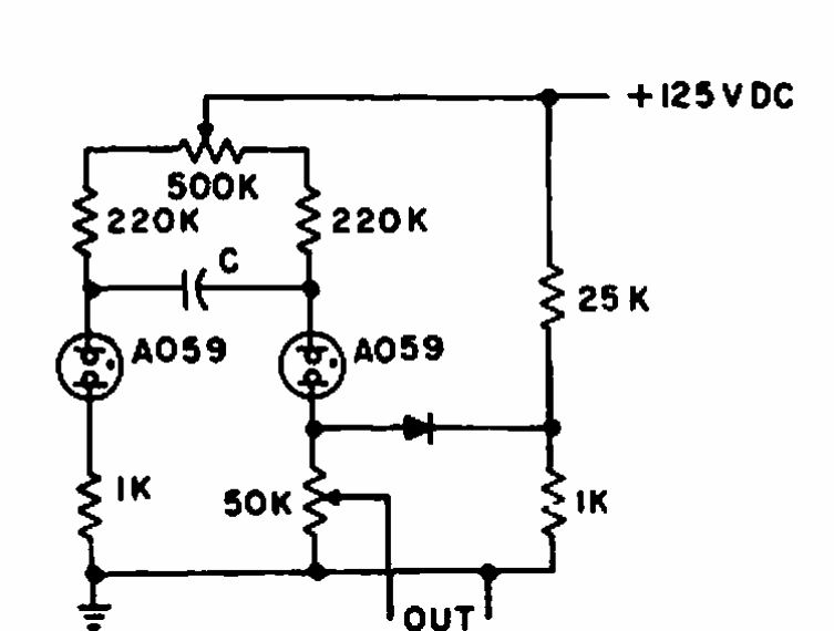 Encontrado em documentação antiga, este oscilador opera com alta tensão. O diodo deve ser de tipo apropriado com baixa corrente e uma tensão inversa de pelo menos 100 V.