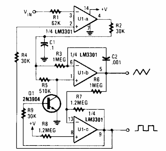Este circuito PLL com operacionais comuns foi encontrado numa Popular Electronics dos anos 90. A fonte de alimentação não precisa ser simétrica.
