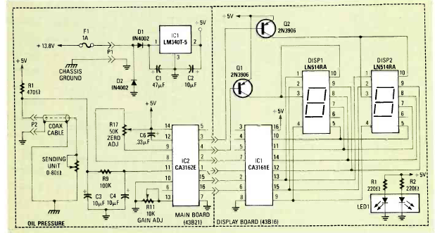 Este circuito foi encontrado na revista Radio Electronics de julho de 1990. A base está nos Cis indicadores de 3 dígitos CA3161 e CA3162.