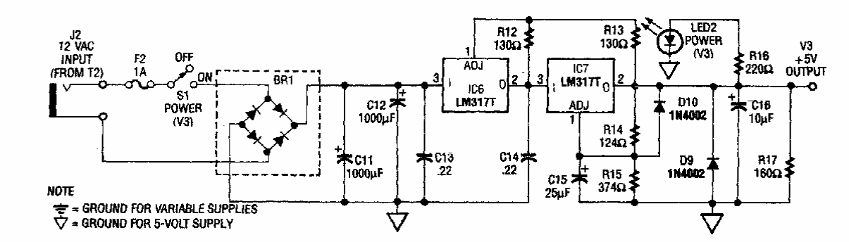 Este circuito foi encontrado numa Electronics Now dos anos 90. A corrente máxima é de 1,5 A, dada pelos reguladores. Os reguladores devem ser dotados de dissipadores de calor.