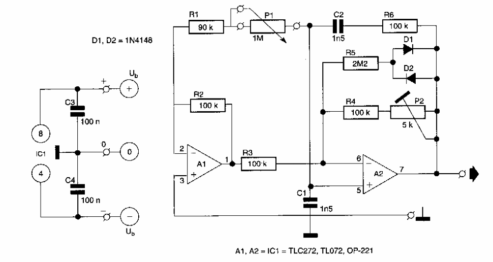 Este circuito gera sinais senoidais entre 300 e 3000 Hz. Encontramos numa 303 Circuits dos anos 90. Os operacionais são tipos com FET. A fonte de alimentação deve ser simétrica.