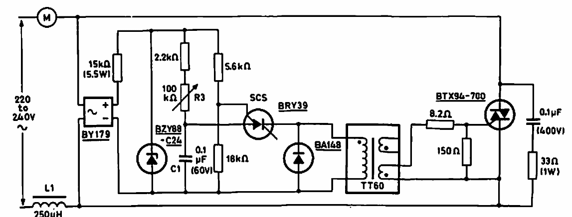 Este potente controle de motor foi encontrado numa publicação da Philips de 1970. Os componentes são da época e o circuito foi projetado para a rede de 220/240 V.