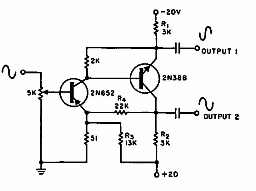 Este circuito foi encontrado numa Electronic Design de 1964. Ele gera sinais de fases opostos a partir de um sinal de entrada. Transistores equivalentes modernos podem ser usados na mesma configuração.