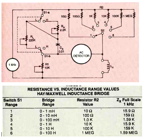 Esta ponte de Maxwell para diversas grandezas foi encontrada na revista Electronics Now de outubro de 1995. Veja na tabela os valores dos componentes para resistências e indutância.