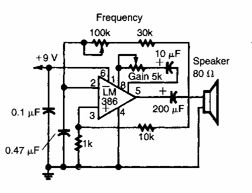 Alimentado por tensões de 6 a 12 V, este circuito de uma Popular Electronics dos anos 90, gera um sinal de áudio de boa potência para as mais diversas finalidades.