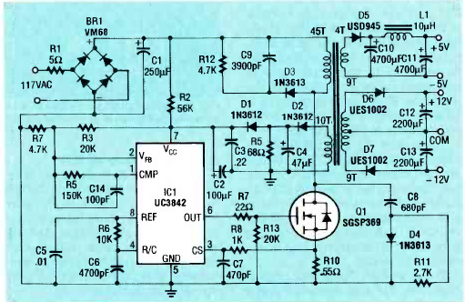 Esta fonte chaveada múltipla foi encontrada na revista Radio Electronics de abril de 1991. O MOSFET deve ser dotado de dissipador de calor.