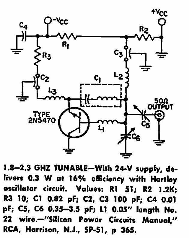 Encontrado num manual da RCA dos anos 60, este circuito usa componentes da época. Ele pode gerar sinais de 1,8 a 2,3 GHz, sintonizáveis.