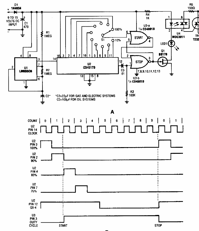 Este circuito sequencial com acoplador óptico foi encontrado numa Popular Electronics dos anos 90 para acionar o sistema exaustor de um forno, ligando o regularmente. O circuito pode ser modificado para outras aplicações.