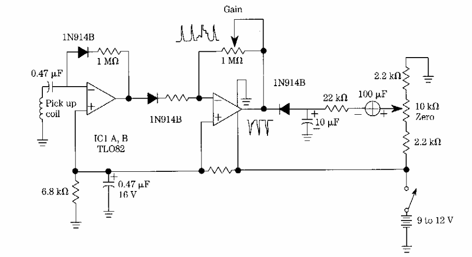 Encontramos este circuito numa documentação americana. Os componentes usados são comuns e a bobina sensora consiste num captador telefônico. Pode ser improvisada com o enrolamento primário de um pequeno transformador de 110 V sem núcleo. Onde se vê 100 uF é na realidade um microamperímetro de 100 uA.