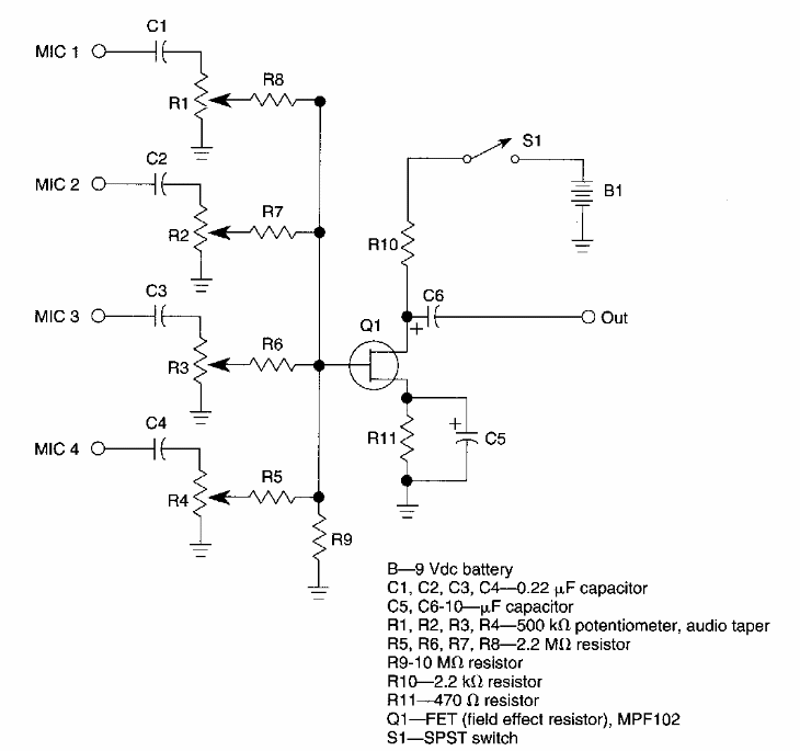 Encontrado numa documentação americana dos anos 90, este circuito tem configuração bastante explorada em outros artigos deste site. O FET pode ser o MPF102 ou equivalente.