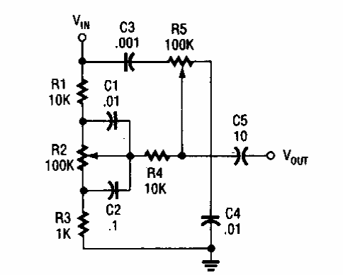 Este circuito passivo foi encontrado num Electronics Hobbyst Handbook de 1993. O circuito tem a configuração Baxandall convencional.
