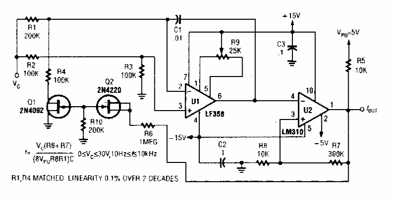 Este VCO de 3 décadas de faixa de funcionamento foi encontrado numa Popular Electronics dos anos 90. O circuito usa componentes que admitem equivalentes.