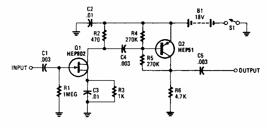 Este circuito que pode amplificar sinais de 0 a 30 MHz foi encontrado numa Popular Electronics dos anos 90. Os transistores admitem equivalentes atuais. A impedância de entrada é alta.