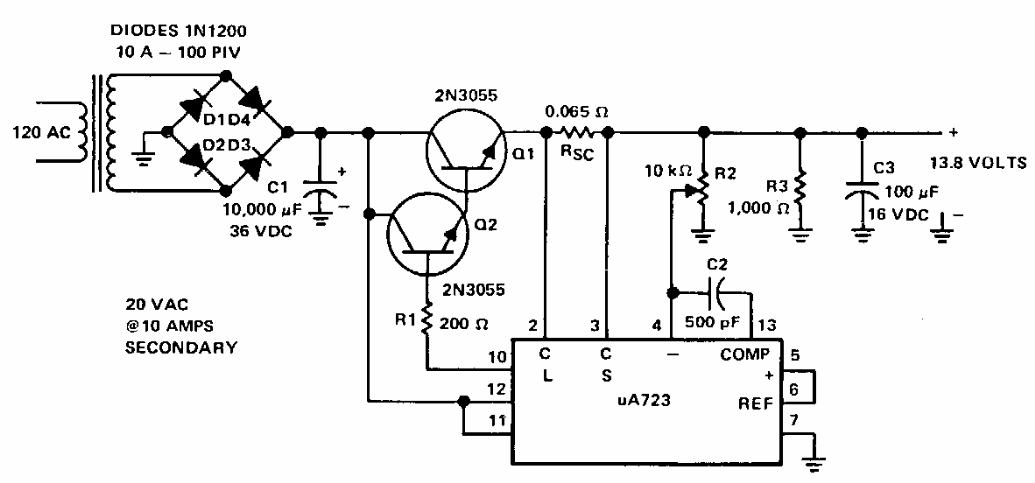 Esta fonte para 13,6 V com 8 A de saída foi sugerida pela Texas Instruments em documentação dos anos 90. Os transistores de potência devem ser dotados de bons dissipadores de calor.