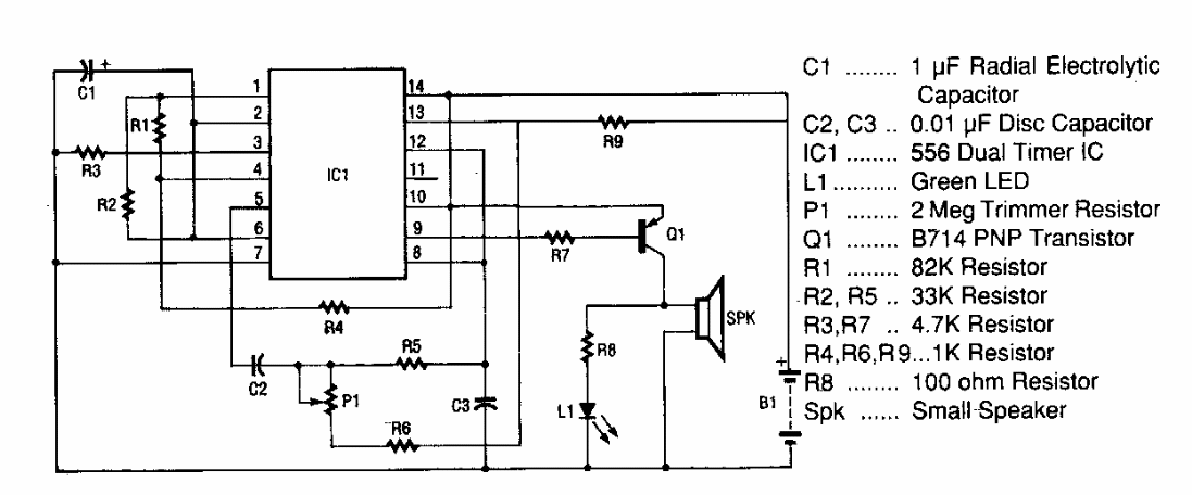 Encontrado num PE Hobbyst Handbook dos anos 90, este circuito imita o som de uma pistola espacial. Os componentes são comuns, podendo ser feitas alterações para modificar os sons.