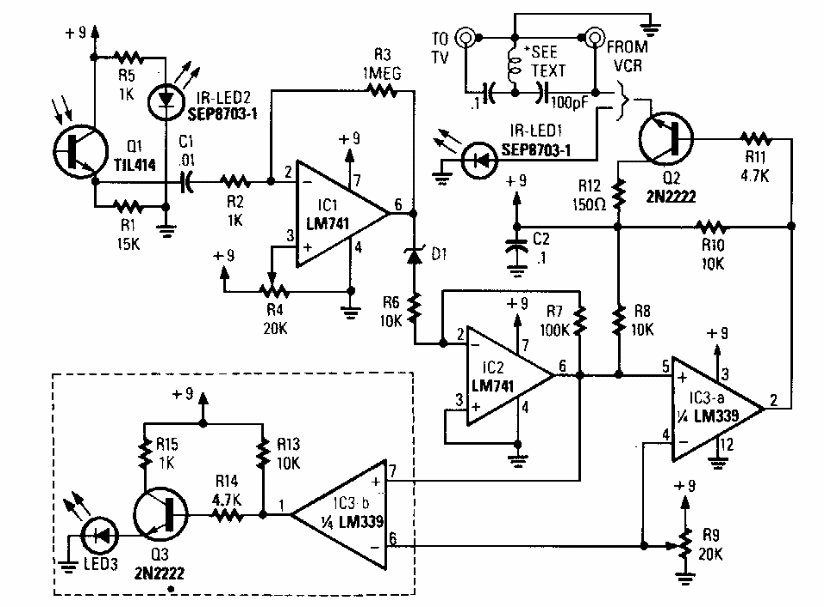 Usado com controle remotos infravermelhos da época, este circuito foi encontrado num RE Experimenter Handbook de 1991. Pode não funcionar com controles remotos mais rápidos usados atualmente.