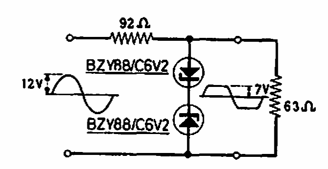 Sugerido pela Philips em documentação de 1966, este limitador pode ser encontrado em outros pontos deste site. O circuito é para 7 V, mas pode ser alterado para outras tensões, conforme os diodos zener.