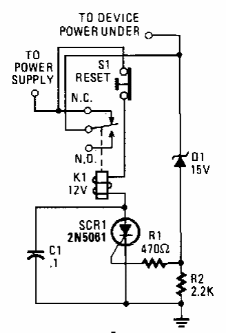 Este circuito com reset foi encontrado numa Popular Elctronics dos anos 90. Ele é usado na proteção de fontes, fazendo seu desligamento em caso de sobretensão.