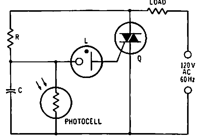 Encontrado em uma documentação da RCA dos anos 60, este circuito se aplica a maioria dos triacs comuns. O disparador é uma lâmpada neon e o sensor um LDR. R é 100k tipicamente e C de 220 nF.