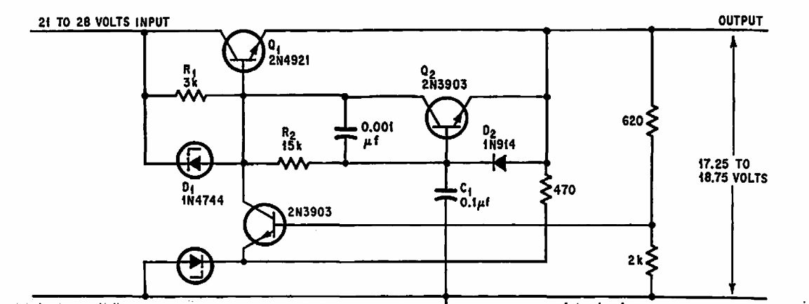 Sugerido por uma documentação de 1968, este circuito limita a corrente de um regulador, podendo ser adaptado para outras correntes. Os transistores são da época.