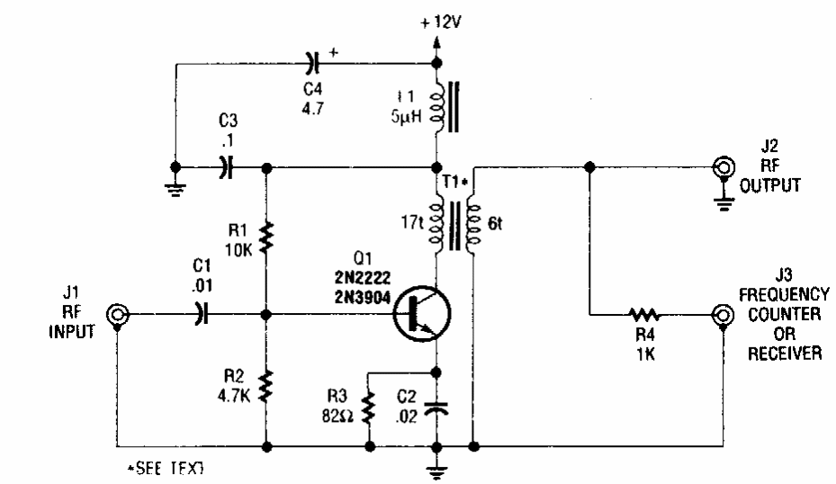 Encontrado numa Popular Electronics dos anos 90, este circuito amplifica sinais numa ampla faixa de frequências.