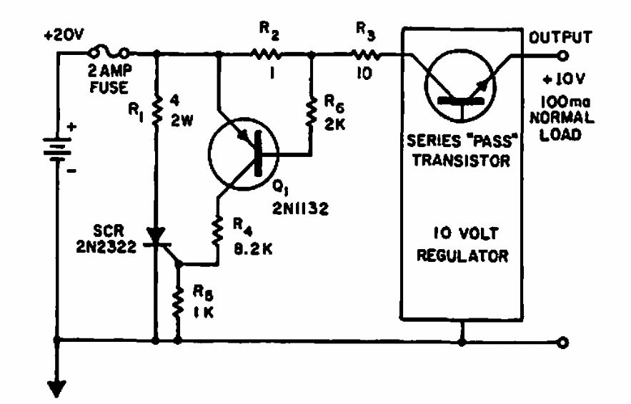 Este circuito de proteção dispara queimando rapidamente o fusível em caso de sobrecorrente. O circuito é de uma Electgronic Design de 1964. O transistor pode ser de uso geral.