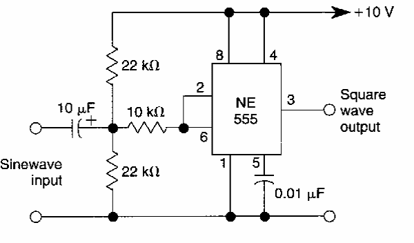 Encontrado numa documentação americana dos anos 90, este circuito consiste num disparador que gera sinais retangulares a partir de uma entrada de sinais senoidais.