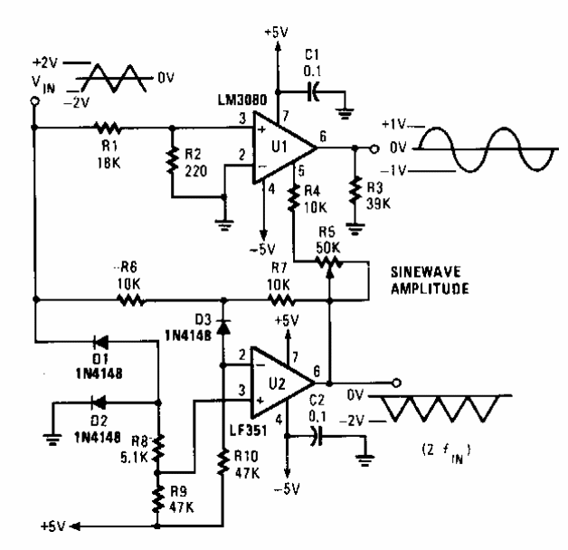 Com este circuito é possível obter um sinal senoidal a partir de um sinal triangular. O circuito é de uma Popular Electronics dos anos 90. Os circuitos integrados admitem equivalentes.