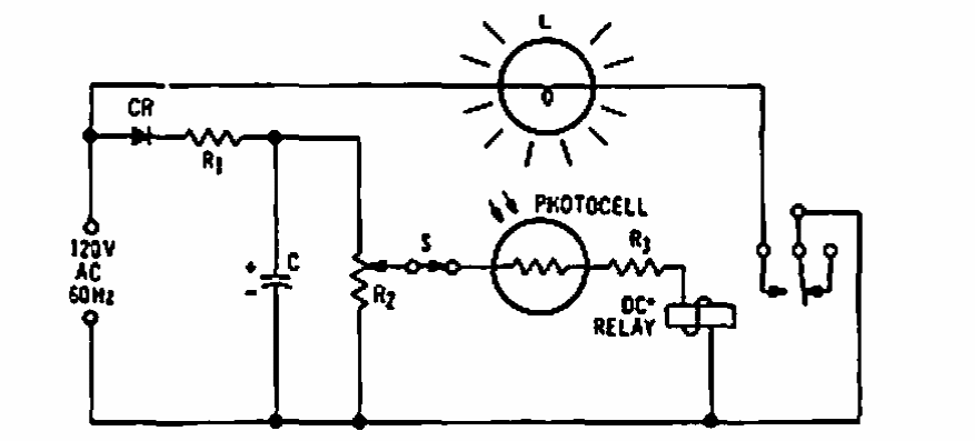 Encontramos este circuito num manual da RCA dos anos 70. O circuito usa um LDR acionando diretamente um relé sensível. O resistor R1 é de 5,6 ohms e R2 de 25k. O potenciômetro é de 10k de fio.