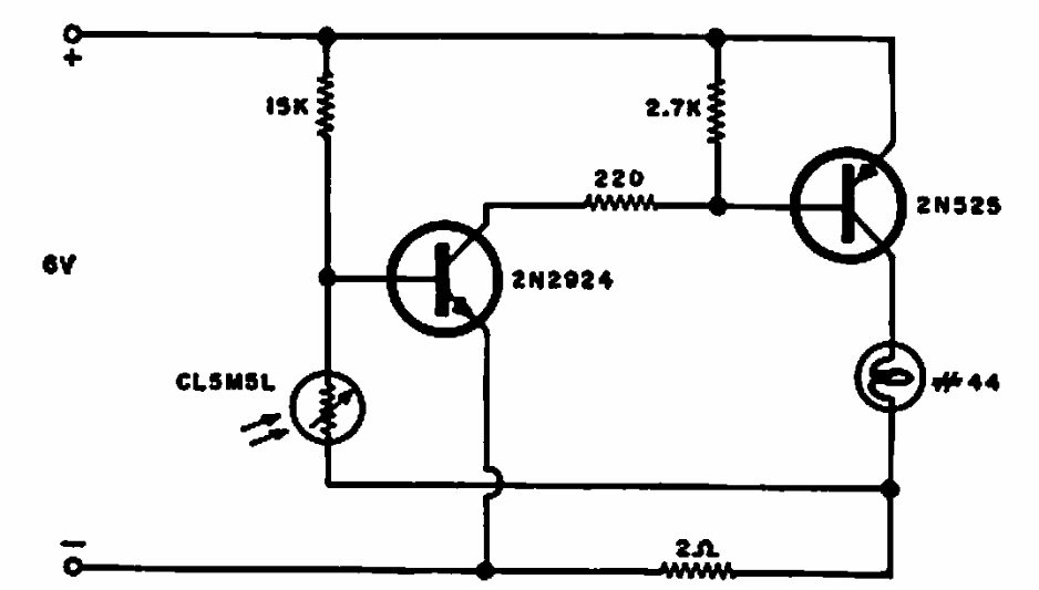 Encontrado numa Electronics World de 1968, este circuito usa componentes da época. Neste circuito, uma pequena lâmpada incandescente é acionada quando escurece.