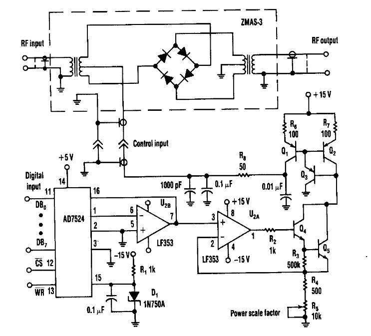 Este atenuador digital de sinais foi encontrado numa Electronic Design dos anos 90. O circuito opera em frequências que são determinadas pelas características do circuito atenuador.