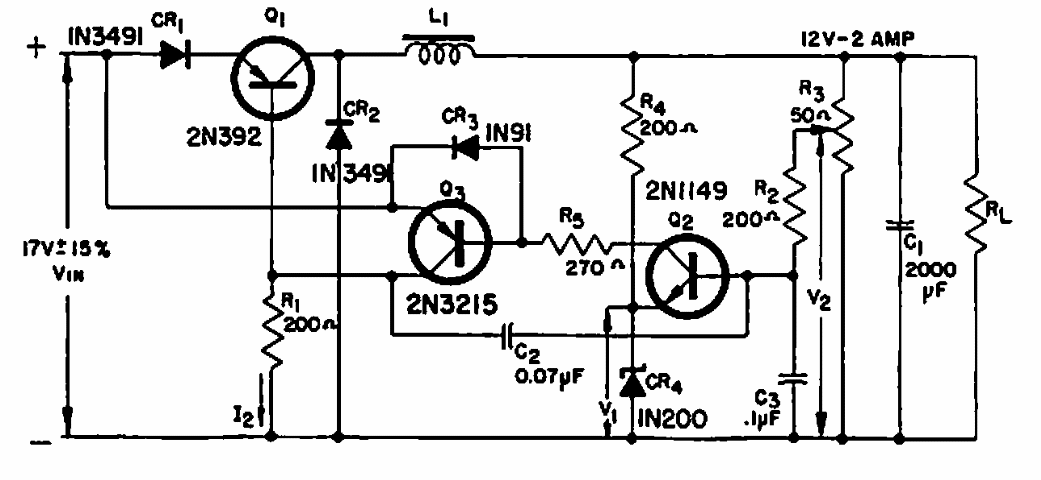 Encontrado em documentação da Delco Radio de 1965 este circuito usa transistores da época. Podem ser usados equivalentes modernos. Não foram dadas as características do indutor.