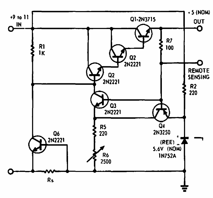 Encontrado numa EDN de 1969, este circuito de alta corrente, não indicada na documentação, usa transistores da época. A tensão de entrada pode ficar entre 9 e 11 V.