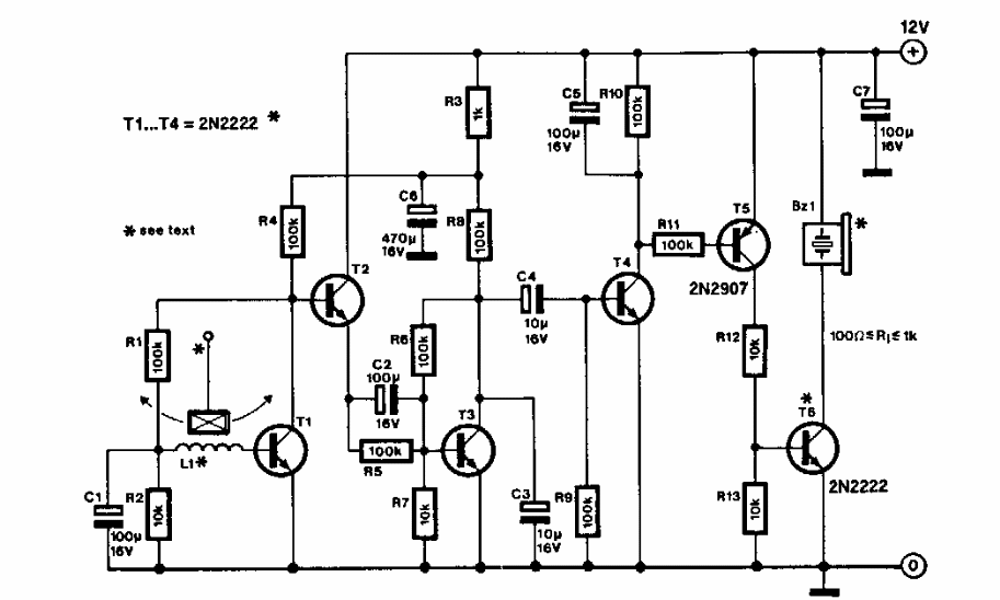 Este sensível sensor de movimento com sensor indutivo foi encontrado numa Elektor dos anos 90. O circuito usa apenas transistores acionando um buzzer.