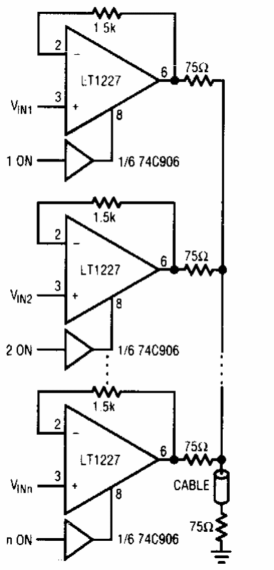 Este circuito é um mixer para sinais de vídeo. Encontramos em documentação da Linear Technology dos anos 90. Os componentes usados são da época.
