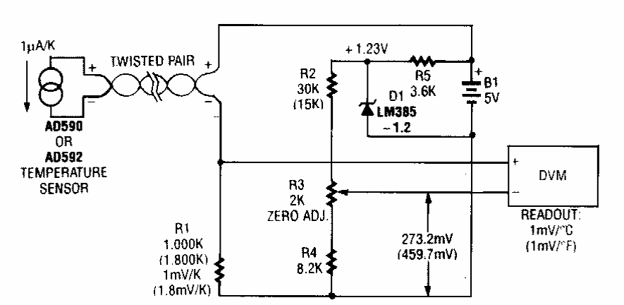 Encontrado numa Radio Electronics dos anos 90, este circuito faz uso de um AD590 ou AD592 para transmissão remota de temperatura. O circuito produz uma tensão de 1 mV para cada grau centígrado.