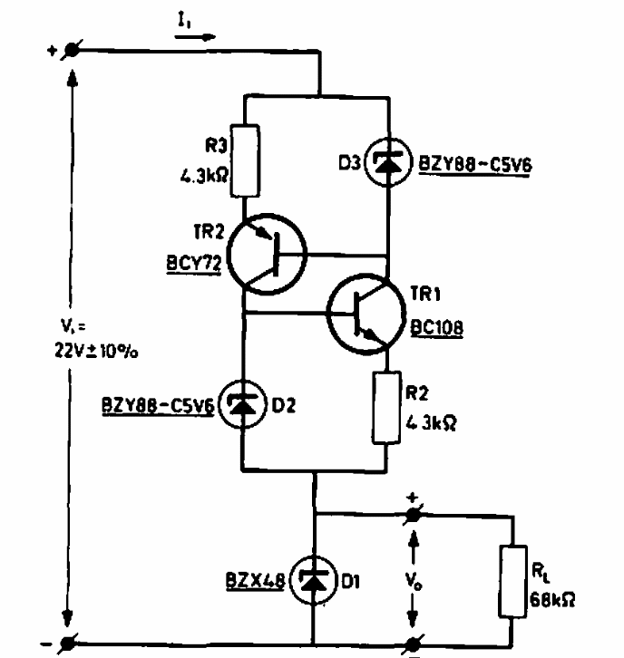 Este circuito foi encontrado em documentação europeia de 1968. Trata-se de um regulador de corrente utilizando transistores complementares de uso geral.