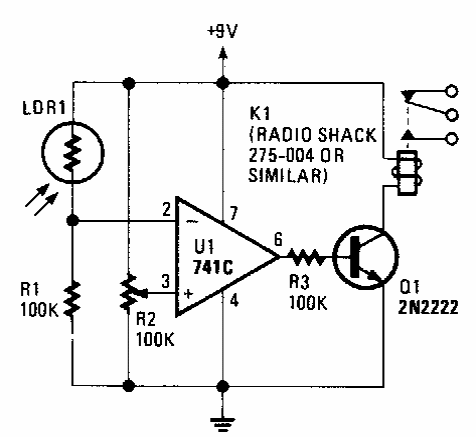Usando um LDR como sensor, este circuito de uma Hands On Electronics dos anos 90 dispara um relé na presença de luz. A alimentação deve ser de acordo com a tensão do relé usado.