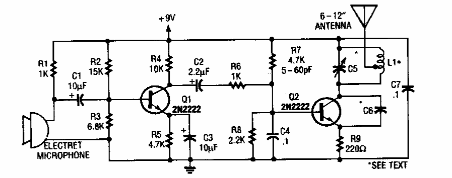 Encontrado numa Radio Electronics dos anos 90, este pequeno transmissor tem bom alcance. L1 é formada por 3 + 3 espiras de fio 24 em torno de um lápis como referência.