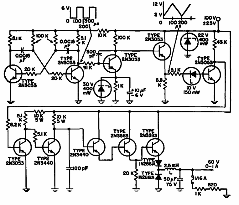 Encontrado numa documentação da RCA dos anos 60, este regulador de 60 V tem entrada de 100 V e uma corrente de 1 A. Os transistores são da época. Pode-se tentar o uso de equivalentes modernos.
