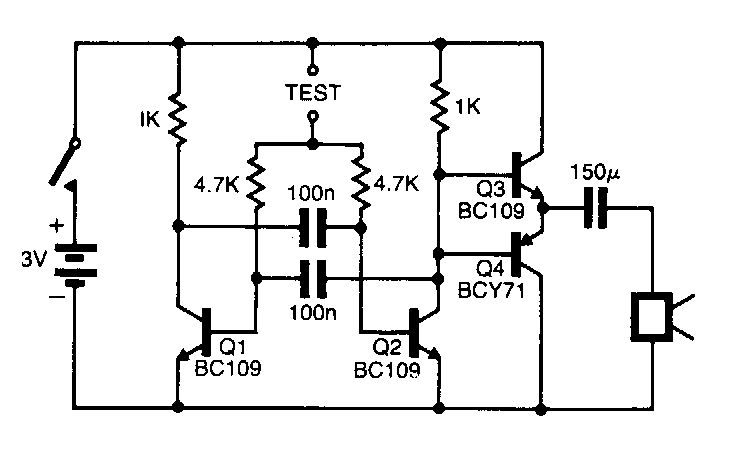 Este teste de continuidade foi encontrado numa Electronic Engineering dos anos90. Os transistores são tipos de uso geral da época com equivalentes como o BC548 e BC558.