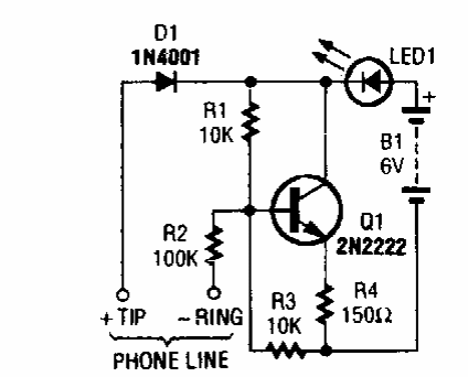 Encontrado numa Popular Electronics dos anos 90, este circuito mantém um LED aceso quando um telefone está em uso. Pode ser usado com extensões.