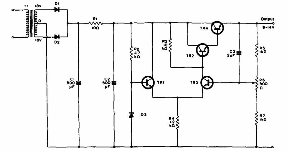 Encontrado numa documentação da Philips dos anos 90, esta pequena fonte pode usar transistores modernos como o BD135 para TR4 e os da série BC para os demais.