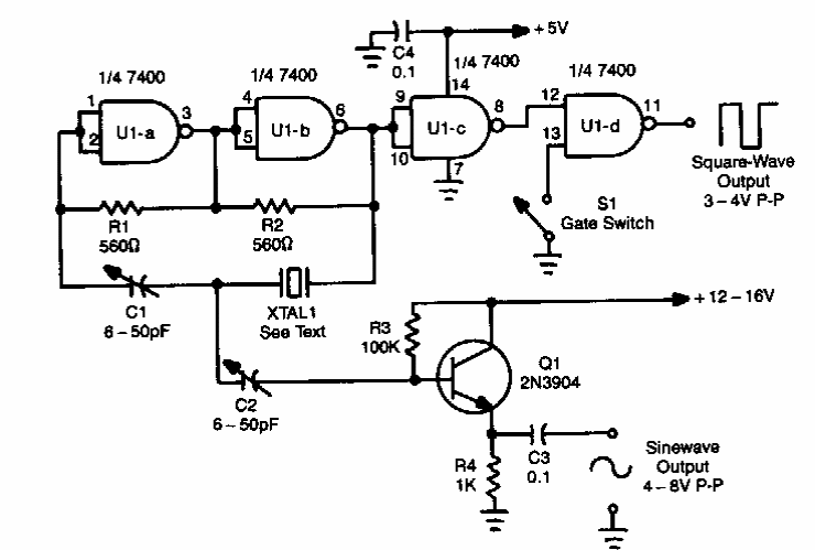 Encontrado numa Popular Electronics dos anos 90 este circuito pode gerar sinais de 1 a 10 MHz conforme o cristal empregado. Pela sua alimentação de 5 V e tipo de sinal, pode ser usado como shield.