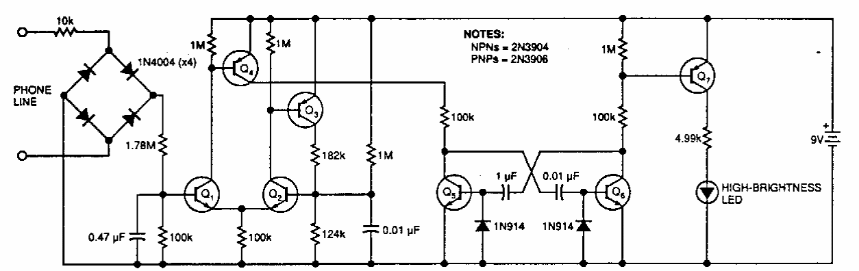 Este circuito telefônico foi encontrado numa EDN dos anos 90. Ele mantém um LED piscando para indicar que houve uma chamada na sua ausência. Os componentes admitem equivalentes.