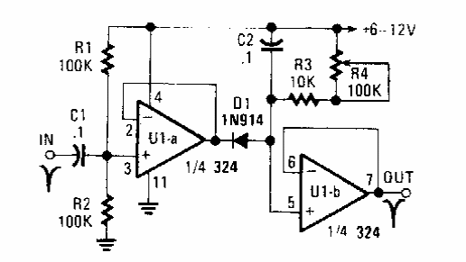 Encontramos este circuito numa Popular Electronics dos anos 90. Ele aumenta a duração de um pulso numa proporção determinada pelos ajustes de R4 e de C2.