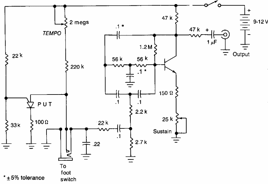Este circuito gera sons amortecidos imitando um tambor ou outro instrumento de percussão com alteração dos componentes do duplo T. Encontramos numa documentação americana antiga.